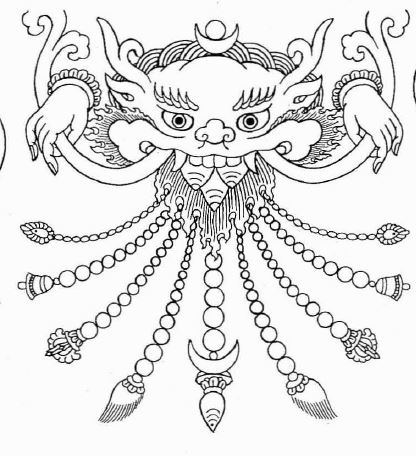 西藏雕塑装饰中类似饕餮纹、天福之面(Kirtimukha)的造型,《藏汉大辞典》描述其为一种虚构的野兽,头如狸猫,鼻部扁平。